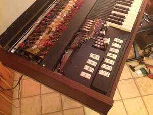 The case was built around the organ as small as possible. Instead of the drawbars for the lower manual, the switches for the percussion were added.