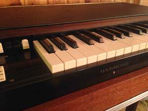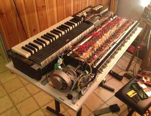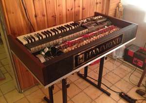 A "chopped" Hammond®. The aim was to build a small, light organ with the sound of a full organ (B3, C3, A100). The manual and the generator come from an M3 built in 1960, 220 volts. The preamp AO 28 comes from a B3. The case was made in-house.