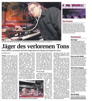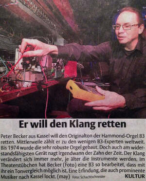 In einer Zeit, in der Autoräder noch Holzspeichen hatten - 1935 - hat Laurens Harnmond in Amerika etwas erfunden, was für Peter Becker aus Kassel noch heute die beste Erfindung ist, die jemals aus den USA kam - die elektromechanische Orgel. Spätestens nach dieser Einordnung Beckers ist klar, dass die Orgel für ihn einen besonderen Stellenwert hat. Und er für sie: Der Kasseler ist einer von weltweit ganz wenigen Spezialisten, die den Originalton des Klassikers - Modell B3 in Verbindung mit einem Leslie-Lautsprechersystem - bewahren können. Er ist ein Jäger des verlorenen Tons. Denn wie das Instrument tatsächlich einmal klang. weiß heute niemand mehr ganz genau. Um aber das zu retten, was man darüber weiß – also den exakten Ton-, hat Becker etwas erfunden, was es so nur einmal gibt: Eine Orgel, die man mit mindestens drei Einstellungen spielen kann. „Das ist so, als hätte man in einem Porsche drei Motoren. Das geht eigentlich nicht". sagt er. Doch Becker hat in Sachen Harnmond- Orgel das Unmögliche möglich gemacht. „Dadurch können sich Musiker aussuchen, welche Einstellung ih· nen zusagt", erklärt er. Und genau das lockt immer mehr Künstler nach Kassel – unter ihnen Harnmond-Fan Helge Schneider. Denn auf dem sehr speziellen Instrument. Peter Becker nennt es „das heiße Teil", kann man auch die ursp1ünglichen, eher dumpf klingenden Frequenztöne sowie die neueren, höhenbeton· ten Töne spielen. Dadurch wird der Vergleich möglich. Von 1954 bis 1974 war das Modell B3 auf dem Markt, wurde extrem robust gebaut. Doch auch am widerstandsfähigsten Gerät nagt irgendwann der Zahn der Zeit. Der Klang verändert sich. „Sehr stark", sagt Becker und erzählt dann von alternden Kondensatoren, die den Ton dumpfer klingen lassen. Davon, dass der Klang sich immer weiter vom Original entfernt habe. Davon, dass man an der Orgel gut schrauben und eigentlich alles reparieren könne. „Das ist mit der B3 wie mit einem Oldtimer. Sie ist nie ganz kaputt und nicht ganz ganz", sagt er und lacht. Nur eine Frage Jahrelang hat er sich immer eine Frage gestellt: Warum klingt die B3, wie sie klingt? Der Antwort - und somit dem Originalton - sei er durch das „heiße Teil" schon ganz nah. Näher gehe es kaum. Wie zum Beweis macht er mit einem Spektrumanalysegerät die Töne sichtbar, wertet sie aus. Dabei geht es zum Beispiel auch um Nebengeräusche, die das Instrument macht. Die wollte der Erfinder eigentlich nicht haben und versuchte sie zu unterdrücken. Doch genau sie seien es, die dem Klang die besondere Note geben, sagt Becker. Wie etwa das Klacken beim Schließen der Kontakte, das wie ein Schmatzton klingt. Dann gibt es da noch die Geräusche, die nur geübte Ohren wahrnehmen: Die sogenannten, ganz leisen Obertöne und das Ubersprechen. bei dem sich die Töne untereinander beeinflussen. „Im Hintergrund hört man dann viel mehr als den einen, den man eigentlich gedrückt hält." Auch diese Nebengeräusche will er retten - sie machen den Klang aus. Becker geht es auch darum, den gefundenen Ton nicht zu verlieren. Keine leichte Aufgabe. Die B3 wird nicht mehr gebaut - stirbt aus. Und wieder kreist vor allem eine Frage in seinem Kopf: Wie kann das Bewahren des Tons gelingen? Dieser habe rein gar nichts mit dem der Harnmond-Heimorgeln zu tun. „Die klingen fürchterlich", sagt er. Für ihn ist der weit weg von der besten Erfindung der Amerikaner: der Harnmond-Orgel B3.